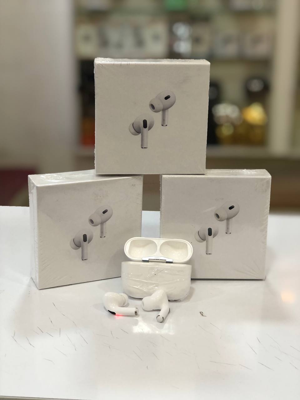 ایرپاد بلوتوثی کالوس مدل M07 به‌همراه کیس شارژ در ویترین فروشگاه مُجیتِل